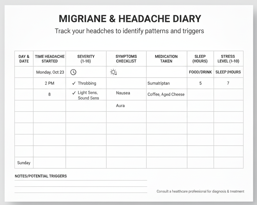 Keeping a detailed headache diary is one of the most effective ways to identify your unique patterns and learn what to avoid.