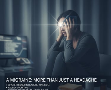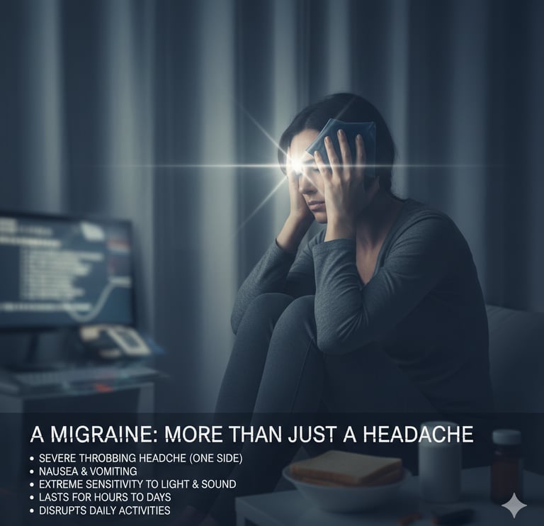 A migraine is a complex neurological disease that causes moderate to severe pain, typically on one side of the head. Unlike a tension headache, it's often accompanied by other symptoms like nausea, vomiting, and extreme sensitivity to light and sound. The pain often feels throbbing or pulsing and can last for hours to days. The pain can be so severe that it interferes with your daily activities.