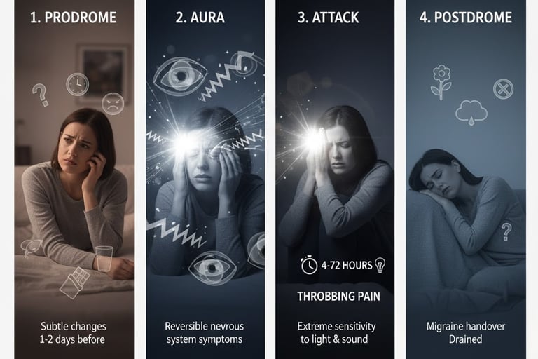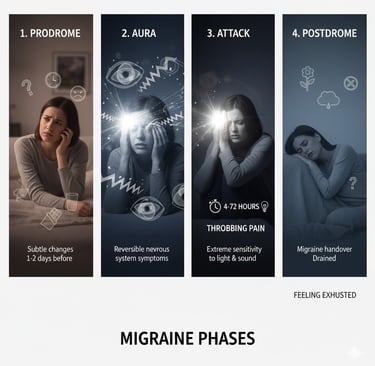 Postdrome: The "migraine hangover" phase after an attack, where you may feel drained or confused.