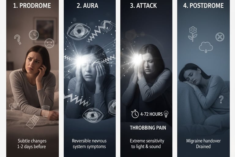 Postdrome: The "migraine hangover" phase after an attack, where you may feel drained or confused.